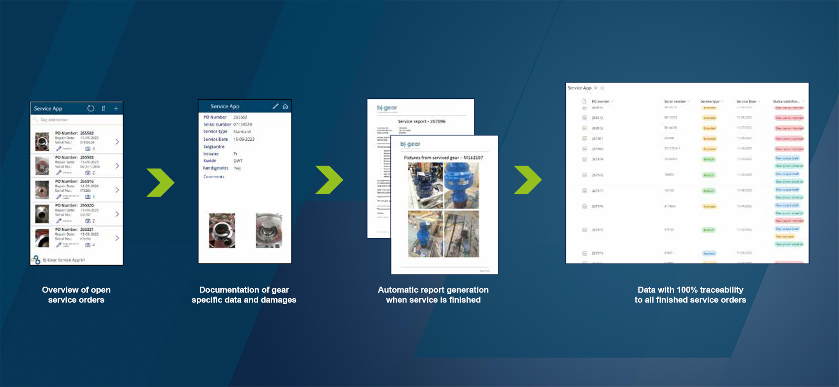 Unsere innovative Service-App wurde entwickelt, um den Serviceprozess und die Dokumentation zu optimieren und bietet eine 100-prozentige Rückverfolgbarkeit Ihrer spezifischen Bestellung. Von der Verwaltung offener Serviceaufträge bis hin zur Dokumentation gerätespezifischer Daten und Schäden sorgt unsere App für Transparenz und Effizienz in jedem Schritt. Dank der automatischen Berichterstellung nach Abschluss des Service können Sie den Fortschritt Ihres Modernisierungsprojekts ganz einfach verfolgen.